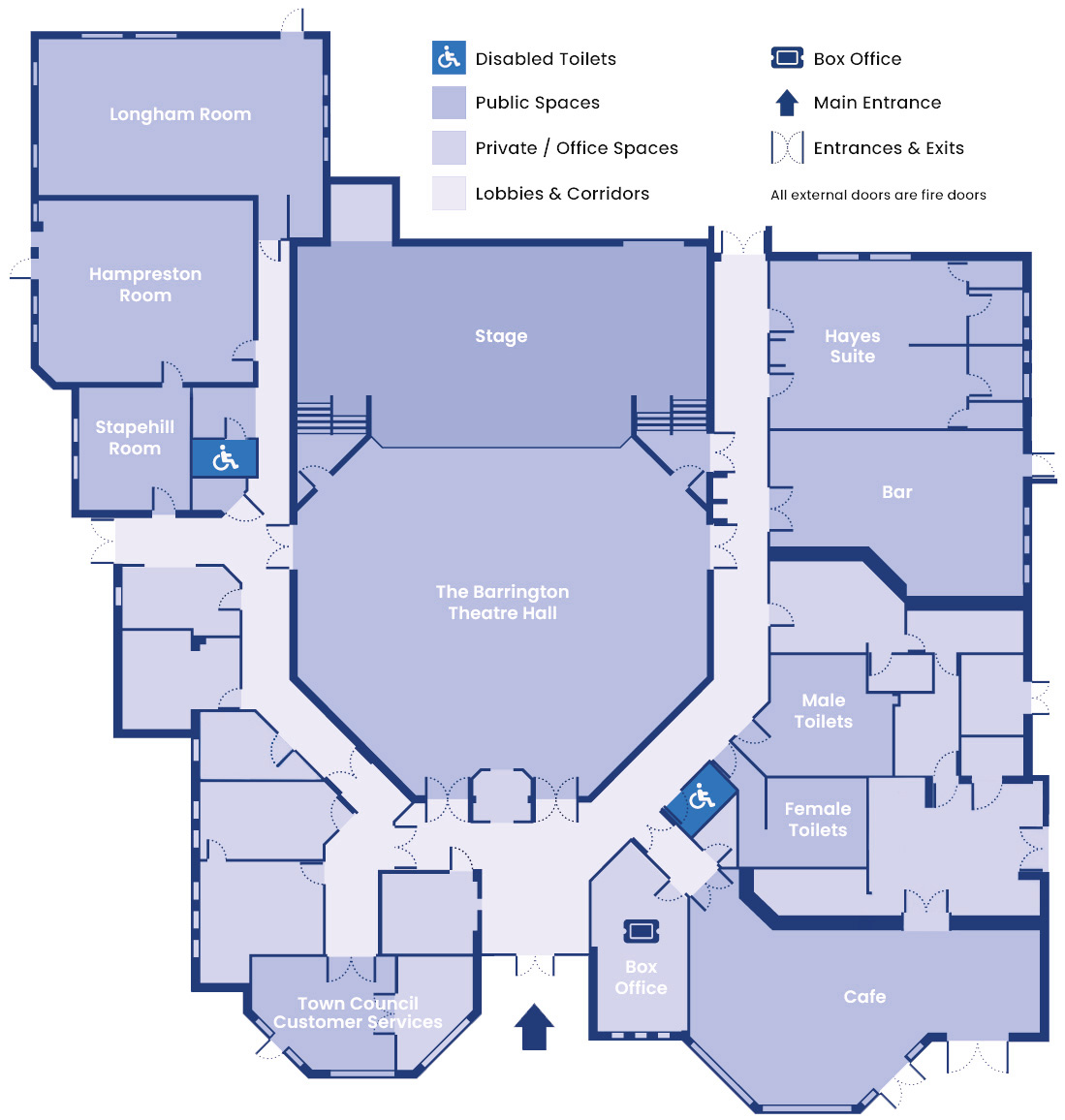 The Barrington Centre is entirely at ground floor level and wheelchair access is via the main entrance. Our outside foyer has a wheelchair ramp and there is level access from all the entrances to the theatre auditorium. All of our spaces can be accessed easily by wheelchair or by patrons with limited mobility.