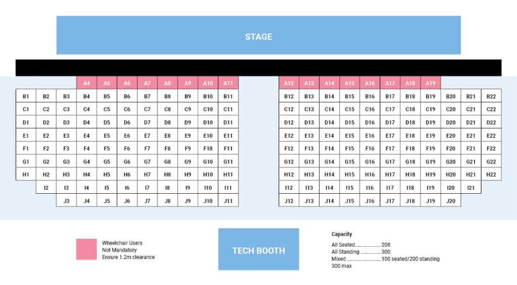 The seating plan displayed below is our typical theatre style plan. We may occasionally change our seating arrangement, or remove the seats entirely, depending on the type of event you’re attending.
